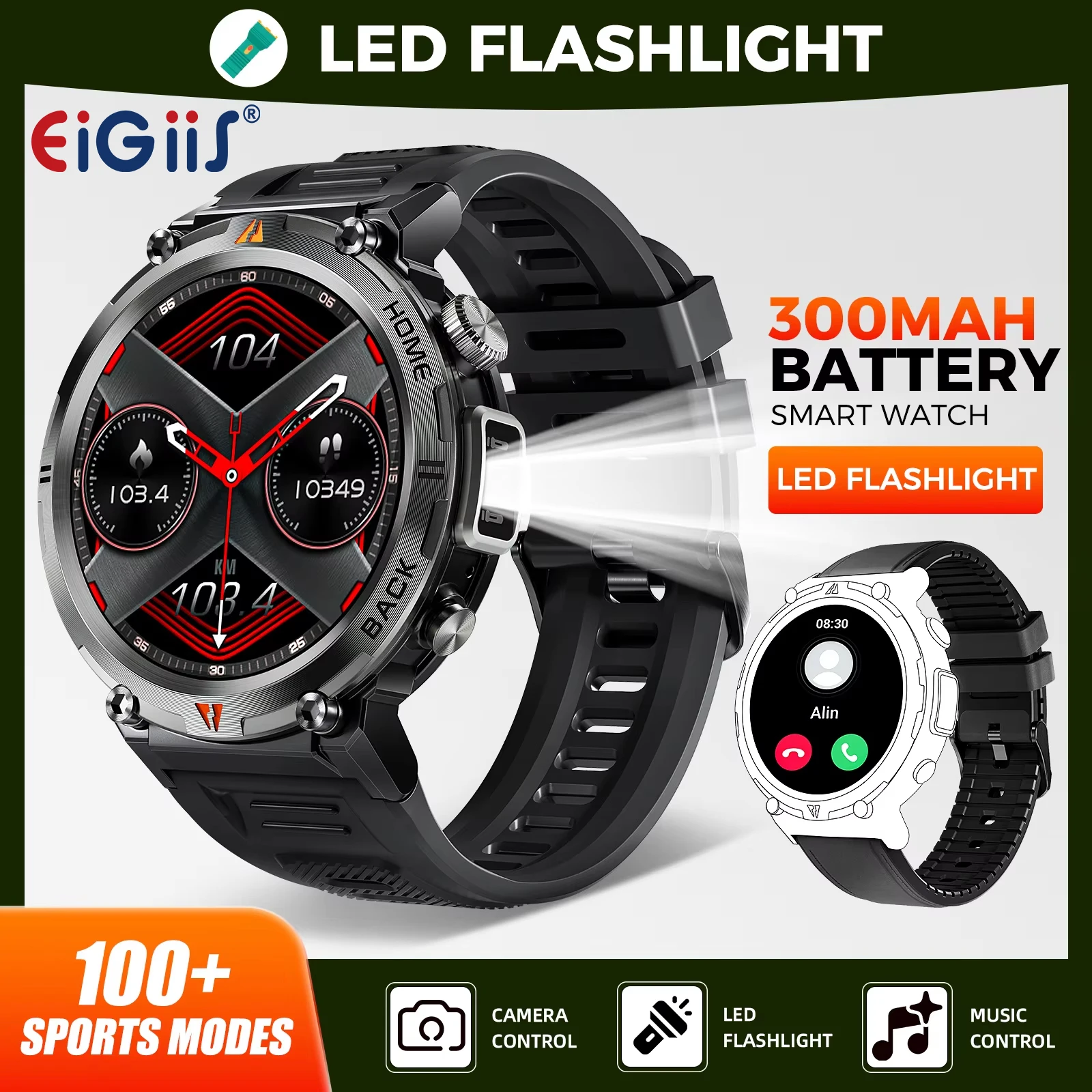 EIGIIS Military Men Smart Watch with LED 1.45" Outdoor Smartwatch with Bluetooth Calls Heart Rate Sleep Monitor Fitness Tracker